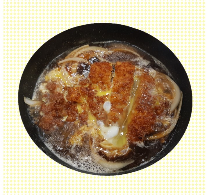 5. 냄비에 소스와 채썬 양파를 넣고 끓이다 튀겨놓은 돈가스를 넣고 육수를 졸이다 풀은 계란을 돈가스 위에 얹혀줍니다.