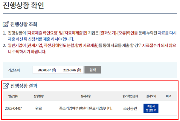 신청서 제출 후 진행상황 확인 탭으로 들어가면 바로 결과를 확인할 수 있습니다.