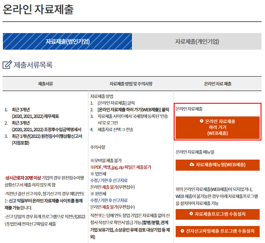 [STEP1] 온라인 자료제출로 들어가서 WEB제출을 클릭하면 퀵파인드 홈페이지로 이동합니다. 법인공인인증서 로그인을 한 후 온라인 자료를 제출을 진행합니다.