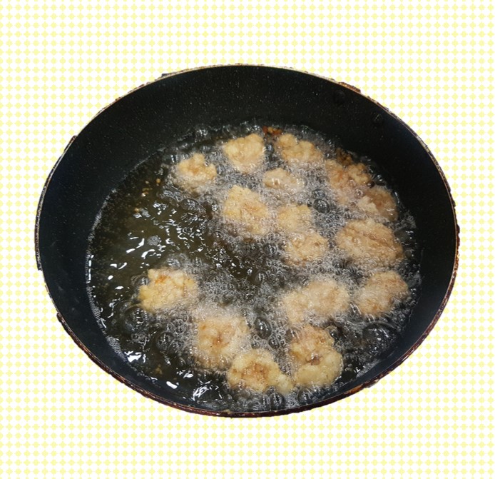 4. 밑간한 닭다리살에 전분가루를 넣어 반죽한 후 기름에 2번 튀겨줍니다.