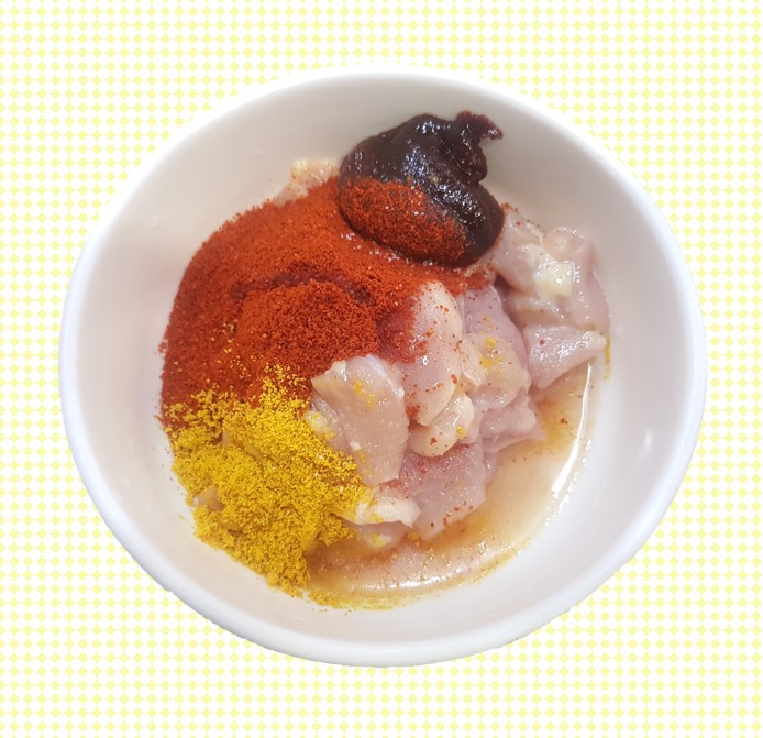 1. 닭다리살은 먹기 좋게 썰은 후 양념장에 버무립니다.