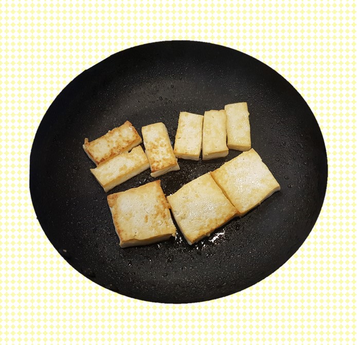 4. 소금간이 된 두부는 물기를 뺀 후 기름 두른 팬에 노릇하게 구워줍니다.