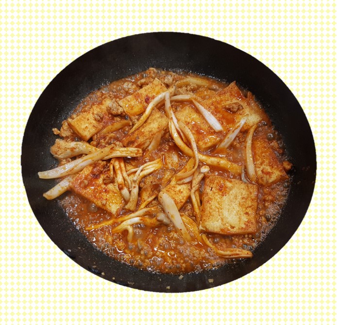 두부 반모, 돼지고기 민찌, 느타리버섯, 양파, 다진 마늘, 소금, 고춧가루, 설탕, 맛술, 후추