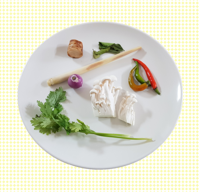 - 태국고추 3개, 새우 2~4마리, 버섯 30g, 레몬그라스 1대, 갈란갈 10g, 라임 잎 2장, 샬롯 1개, 카네이션밀크, 고수약간, 피쉬소스, 라임주스, 똠얌 페이스트