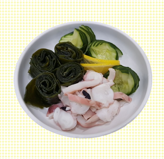 문어, 미역, 오이, 레몬, 식초, 설탕, 소금, 다시마