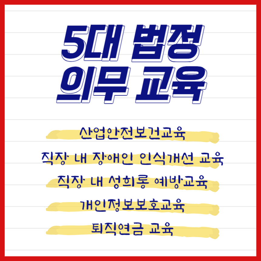 보통 5대 필수 법정의무교육이라고 하죠? 법정의무교육은 대표적으로 5가지 교육으로 나누어집니다.