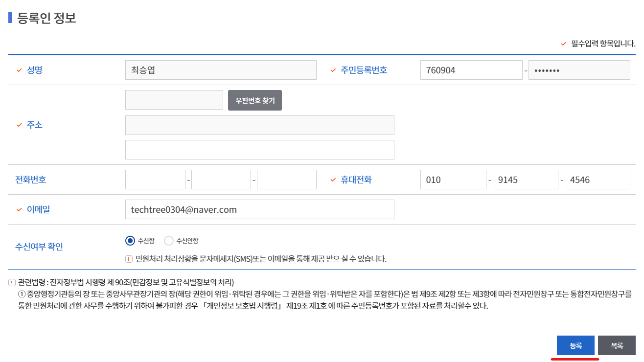 4. 등록인 정보도 입력 후 등록버튼을 클릭하면 끝.