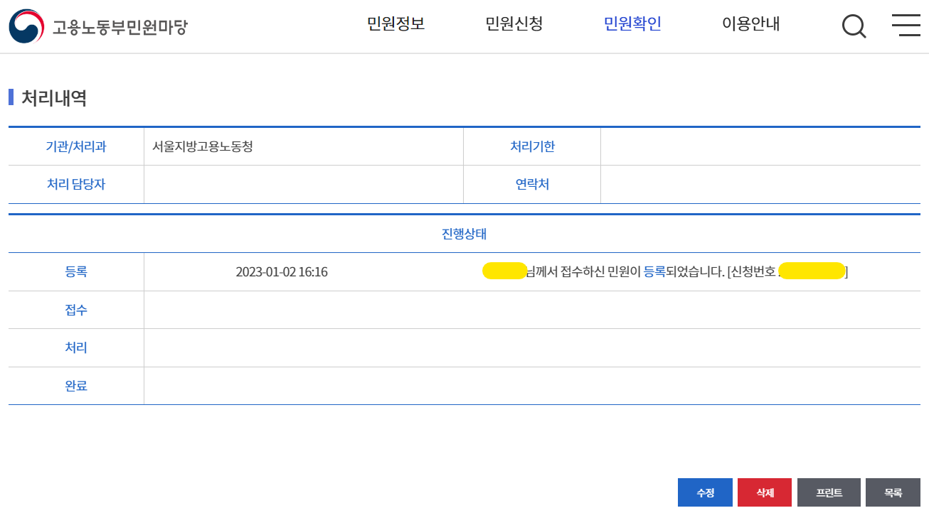 민원확인 > 처리내역에서도 신청번호와 함께 등록완료 되어있는 것을 확인할 수 있습니다.