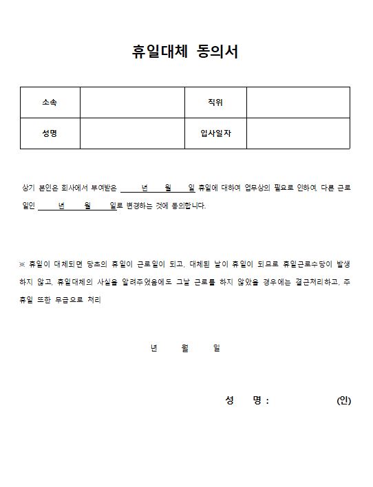 그래서 저희 회사도 대체휴일 근로자들에게는 개별 동의서를 받기로 했습니다.