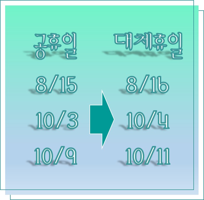 그래서 이번 해에는 광복절, 개천절, 한글날 직후의 월요일이 빨간날이 되었고 정확한 날짜는 요기요 ↓↓↓